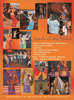 Focus, take stock, grow and access your own: Abundance, Authenticity, Energy and Vitality for Life, Inner Inspiration, Intuition, Motivational tools A 2 night weekend of Personal Growth, Fun, Total Self Indulgent, ME time, includes A variety of leisure and coaching workshop activities, guaranteed to build your own self awareness and confidence. Booking essential in November Marry your mind, heart, soul and body, learn to dance within and embrace nature as your tool - learn more about your choices. 2. NEW - 2012 Belly dance, Beginner levels Teacher Training, in Johannesburg - send your dance cv - to find out if you are eligible for this training, to: charlotte@bellydance.co.za, or dancer@bellydancers.co.za 3. Belly dance classes in PTA EAST and CAPE TOWN and Tribal Fusion classes in Durban West, for details see: http://www.bellydancers.co.za/BellyDancersinSAinyourarea.aspx (copy and paste to your browser) 4. Educational support: for, and from, renown and highly successful Belly Dancers, students and teachers in the art: www.bellydancers.co.za |